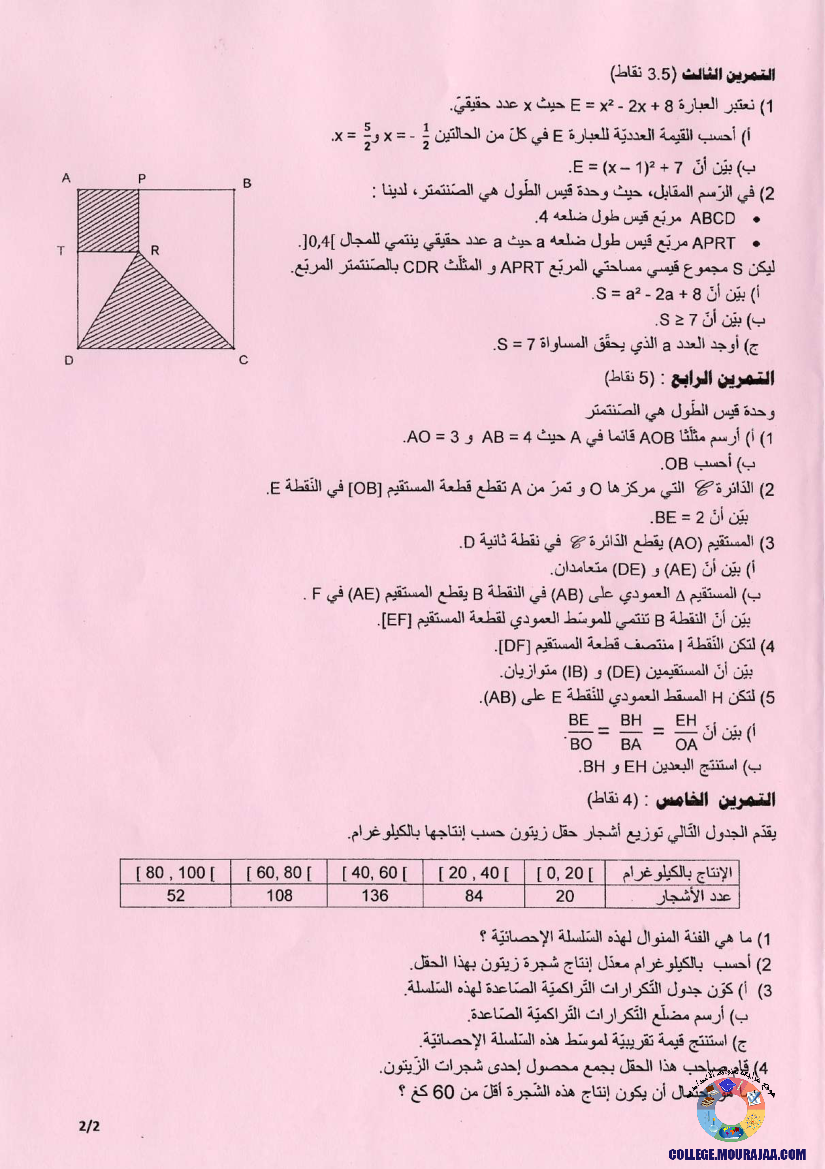 امتحان الرياضيات مناظرة النوفيام سنة 2017