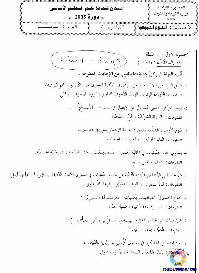 مناظرة شهادة ختم التعليم الاساسي في مادة علوم الحياة و الارض لسنة 2005