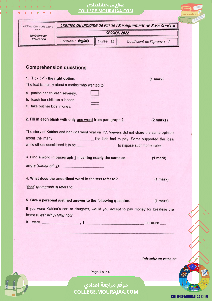 اختبار مناظرة شهادة ختم التعليم الاساسي في مادة الانقليزية لسنة 2022