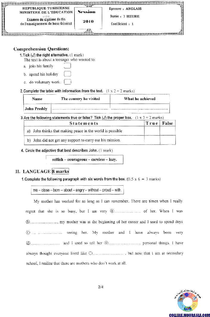 مناظرة شهادة ختم التعليم الاساسي في مادة الانقليزية لسنة 2010