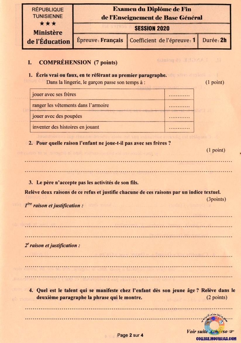 مناظرة شهادة ختم التعليم الاساسي في مادة الفرنسية لسنة 2020