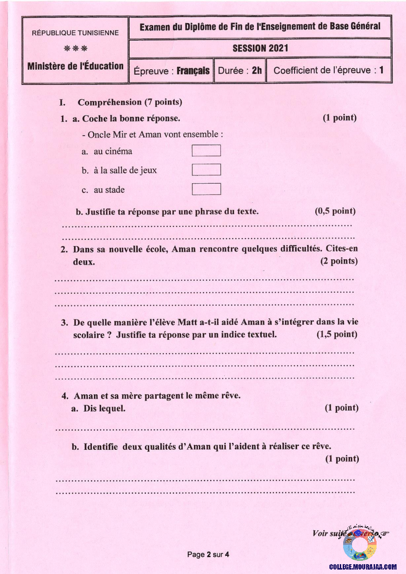 مناظرة شهادة ختم التعليم الاساسي في مادة الفرنسية لسنة 2021