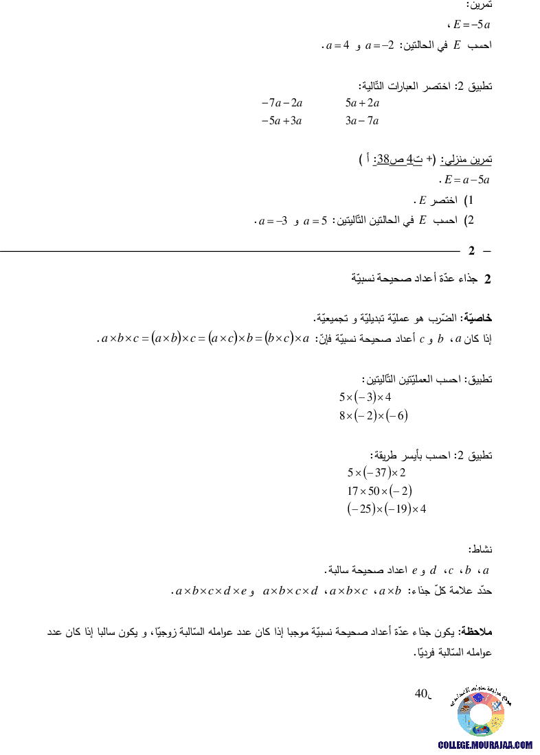 درس حول الضرب في الاعداد الصحيحة في مادة الرياضيات لتلاميذ سنة الثامنة اساسي