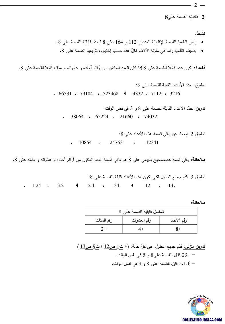 درس حول قابلية القسمة على 8 في مادة الرياضيات لتلاميذ سنة الثامنة اساسي