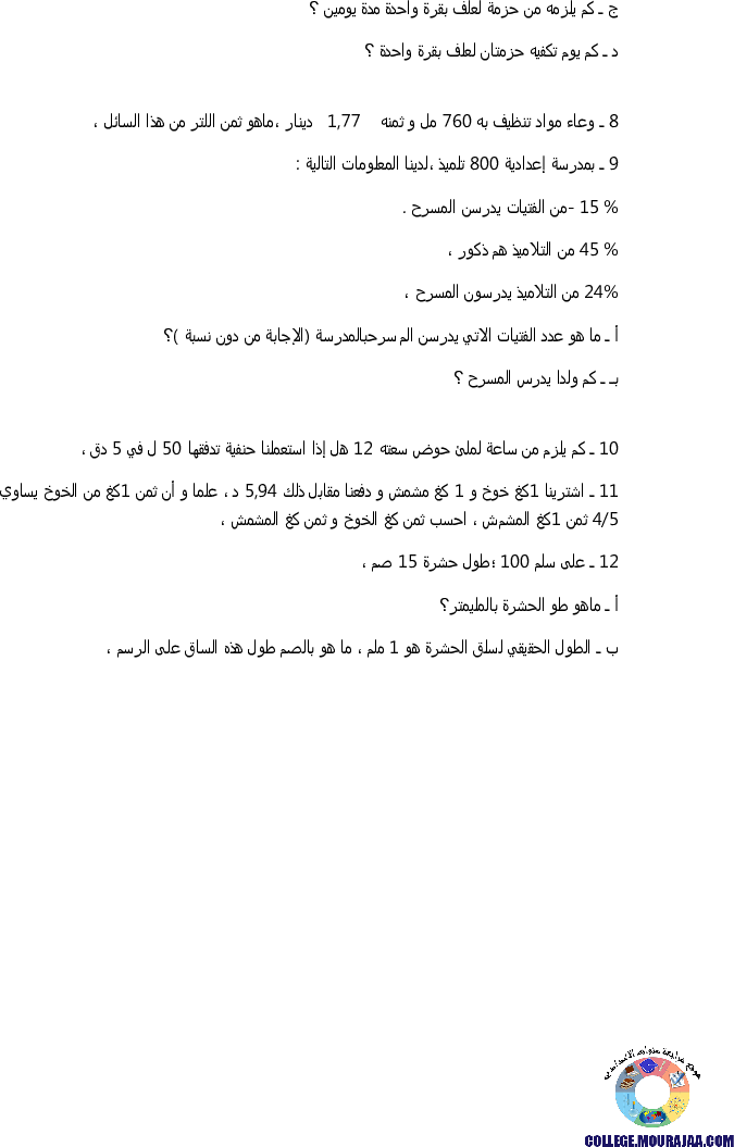 تمارين حول تمارين التناسب في مادة الرياضيات لتلاميذ سنة السابعة اساسي