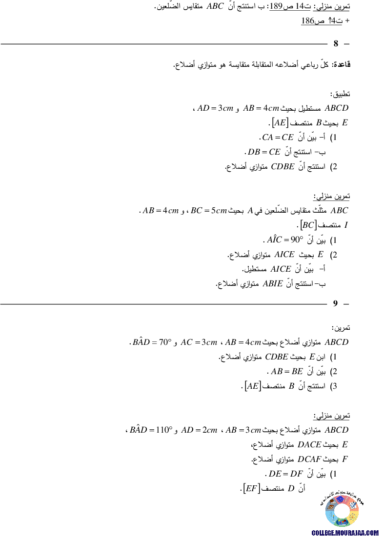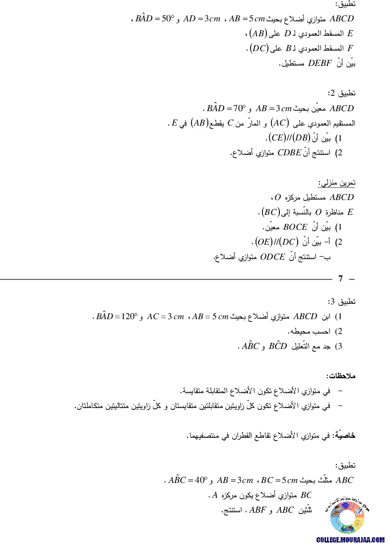 درس حول رباعيات الاضلاع في مادة الرياضيات لتلاميذ سنة السابعة اساسي