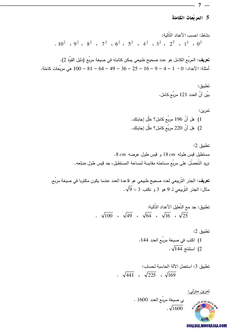 درس حول قوى الاعداد الصحيحة الطبيعية في مادة الرياضيات لتلاميذ سنة السابعة اساسي