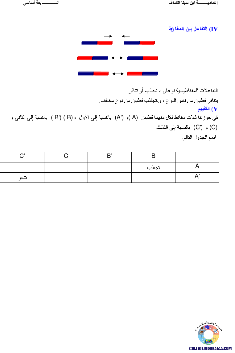 درس حول قطبا المغنط في مادة العلوم الفيزيائية لتلاميذ سنة السابعة اساسي