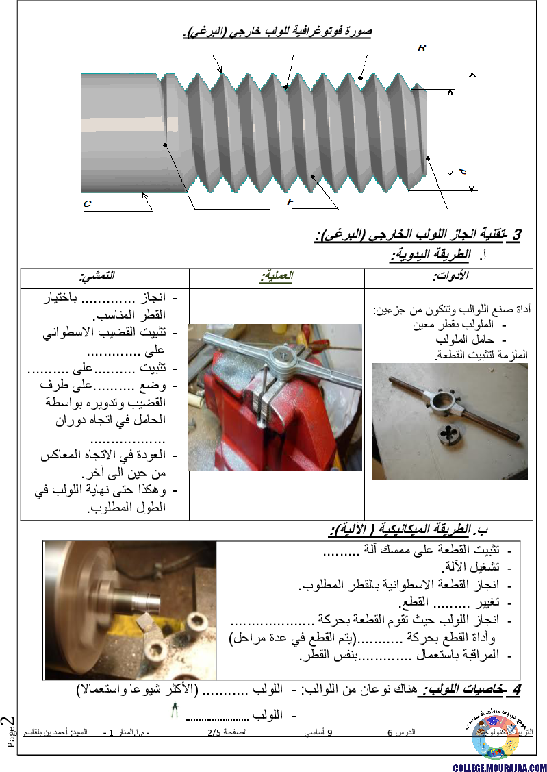 درس حول اللوالب-الخارجية-البراغي في مادة التربية التكنولوجية لتلاميذ سنة التاسعة اساسي
