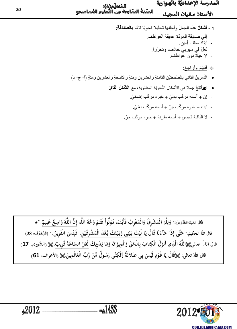 درس حول الأشكالُ-الأساسيّةُ-للجملةِ-الاسميّةِ في مادة العربية لتلاميذ سنة السابعة اساسي