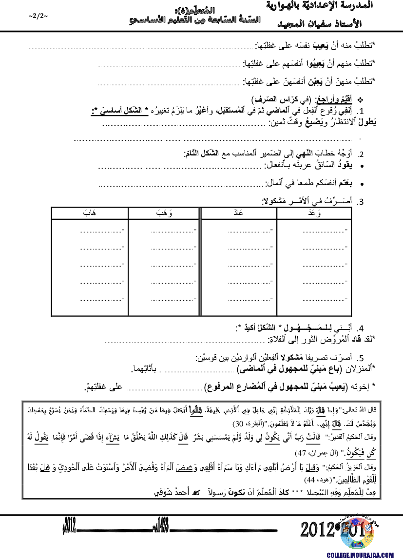 درس حول الْمُعتَلِّ-الْأَجْوَفِ في مادة العربية لتلاميذ سنة السابعة اساسي